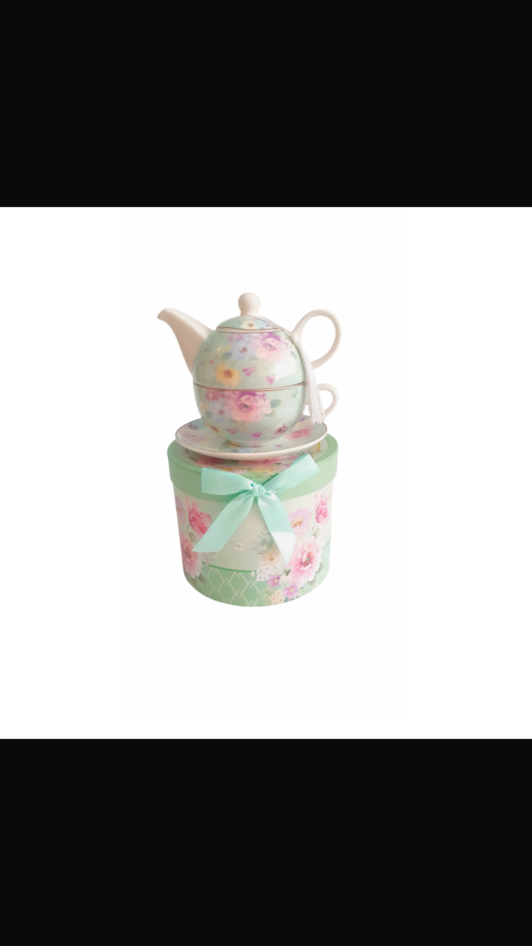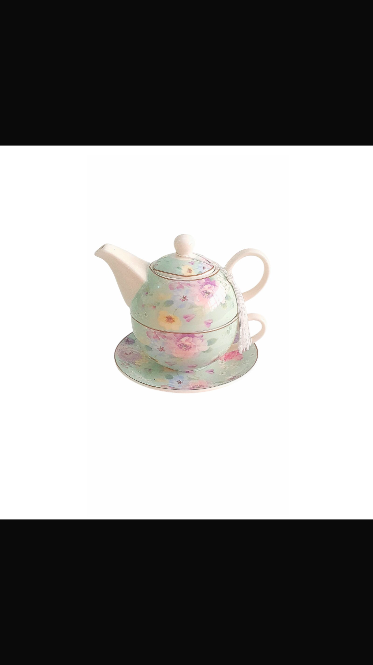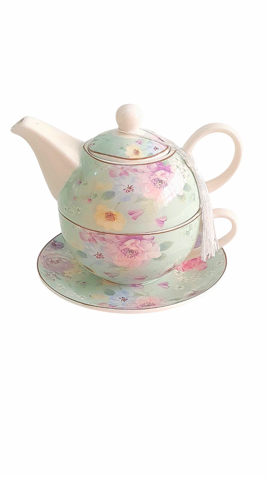 + Free ShippingCeramic Tea for One Set (small teapot stacked above tea cup with saucer). Decorated with a beautiful flowering design.