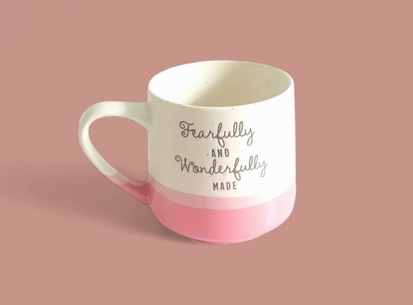 + Free ShippingFEARFULLY AND WONDERFULLY MADE Mug Psalm 139:14 Bible Scripture Verse Gift Pink Double sided embossed text with pink flowers. Ivory color “dipped” two-tone pink bottom with gray lettering. Large mug Holds 16oz with plenty of room. Dishwasher and microwave safe stoneware keeps beverages hot. Large handle design is comfortable to hold.