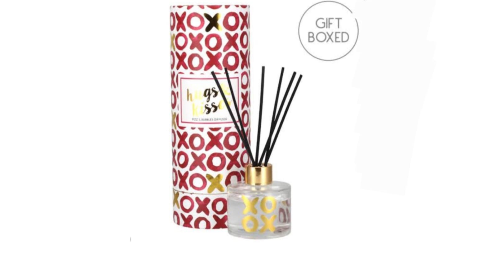 + Free ShippingThe perfect way to send hugs and kisses through the post, this super fun scented reed diffuser ticks all the right boxes! Fragranced with a ‘fizz and bubbles’ prosecco scent, the oil is presented in a cute glass holder decorated with a shiny gold XOXO print. The cute design and metallic gold decoration also extends onto the gorgeous round gift box which includes six stylish scent diffusing black reeds.