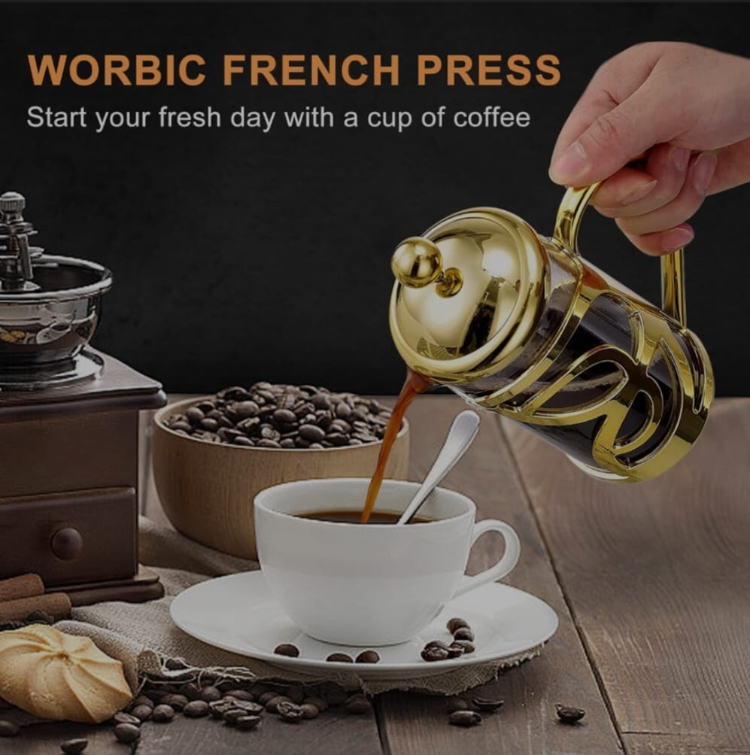 + Free ShippingFrench Press Coffee Maker, 3 Level Filtration System, Coffee Press with Heat Resistant Borosilicate Glass, 12oz Coffee French Press with Coffee Scoop w/Clip & 2 Extra Filters (Gold)